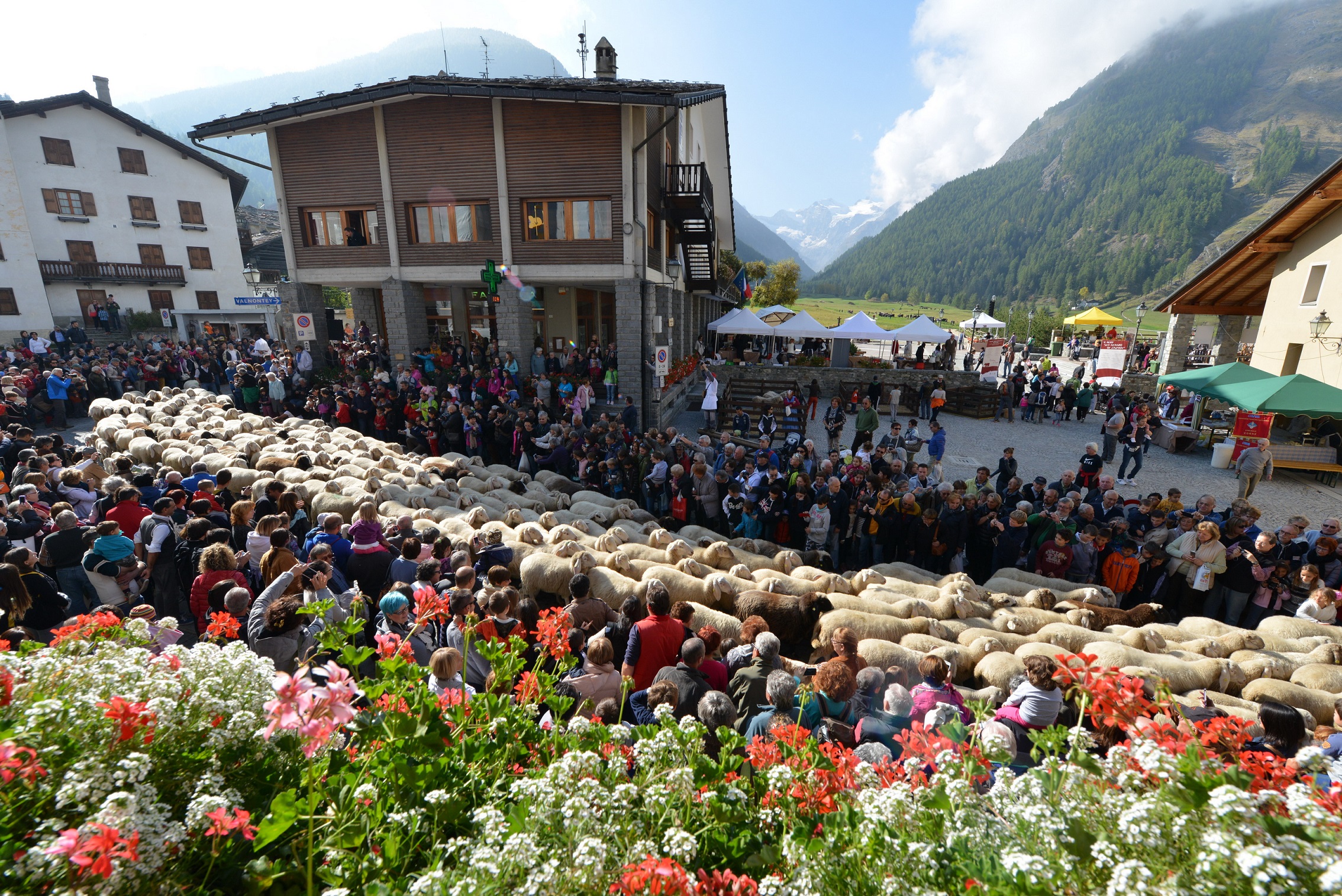 La transumanza si celebra in varie località della Valle d’Aosta, ma una tra le più scenografiche,dove le mucche, spazzolate e addobbate con fiori e ornamenti sfilano in passerella accompagnate dal suono dei campanacci e festeggiate da tutta la comunità locale è quella di Cogne, nella zona del Gran Paradiso”, dove viene chiamata “Devétéya”.